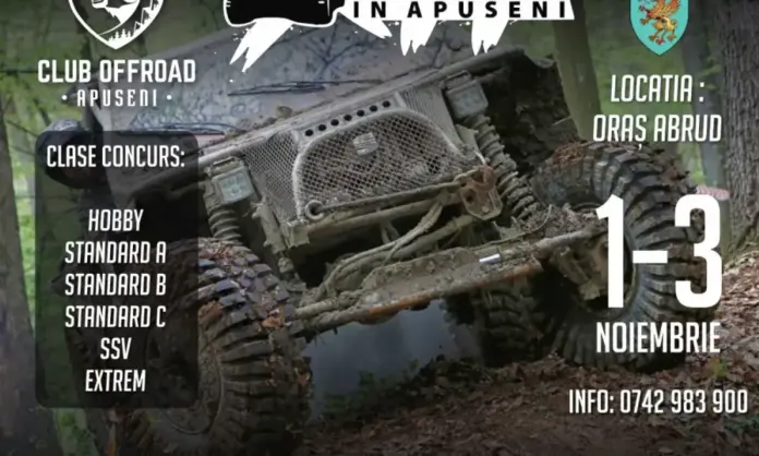 Primul weekend din noiembrie aduce la Abrud praf, mocirlă, motoare turate și maşini şifonate, într-o nouă ediție a evenimentului „Toamnă în Apuseni”, organizat de Club OffRoad Apuseni. Timp de două zile, pasionaţii de off road vor aduce în munţi mii de cai putere, care vor sparge liniştea satelor.