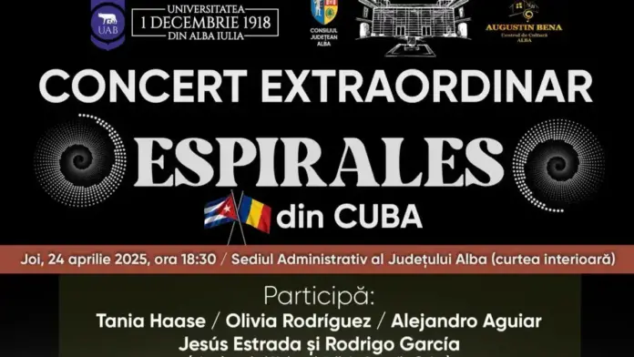 Universitatea „ 1 Decembrie 1918 ” din Alba Iulia, Consiliul Județean și Centrul de Cultură „ Augustin Bena ” vă invită la un concert extraordinar al trupei cubaneze „Espirales”.