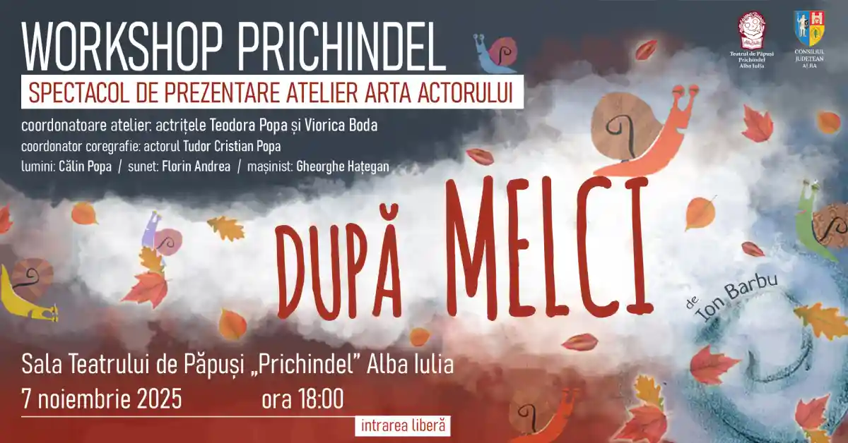 Teatrul de Păpuși „Prichindel” din Alba Iulia prezintă vineri, 7 noiembrie 2025, spectacolul „După melci”, la finalul atelierului de Arta actorului.