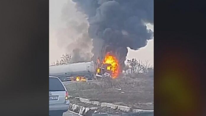 Accident cu trei tiruri pe DN 72. O cisternă a luat foc!