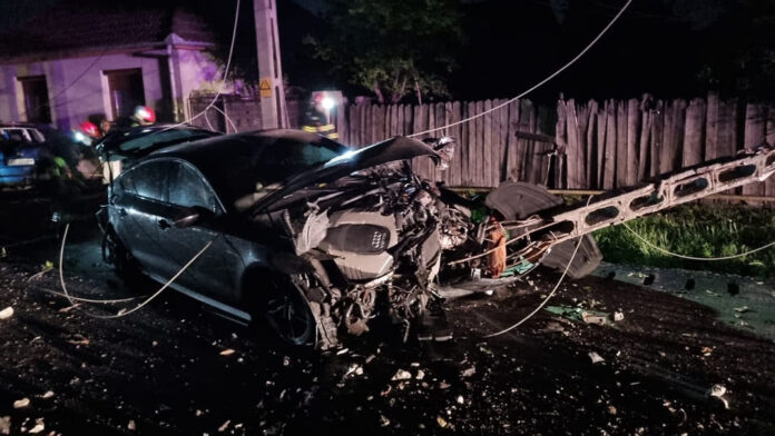 Autoturism distrus aproape în totalitate, după ce a doborât un stâlp de electricitate și a lovit o țeavă de gaz, pe strada Principală din Lancrăm