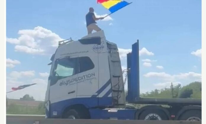 Autostrada A1 a fost blocată pe sensul Pitești – București, duminică, într-o acțiune aparent legată de protestul marcat de violențe și provocări din Piața Victoriei.La originea incidentului de pe autostradă sunt doi șoferi de camion.Momentul blocajului a fost surprins de ceilalți participanți la trafic și distribuit pe rețelele sociale.În imaginile postate, se vede cum un individ urcat pe cabina unui TIR flutură un steag tricolor.Potrivit Antena 3 CNN autorilor…