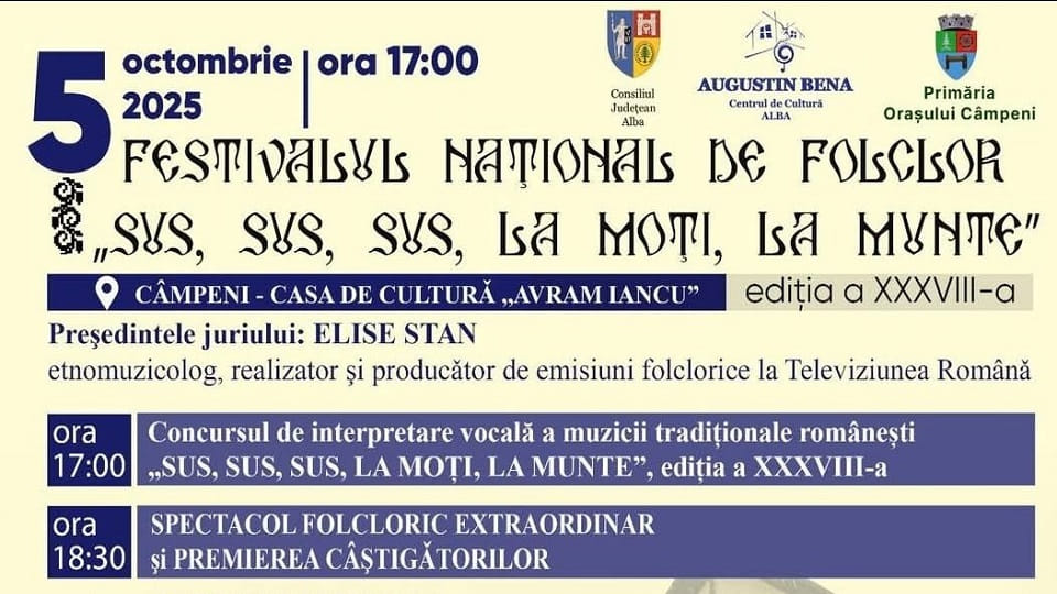 Duminică, 5 octombrie 2025, la Casa de Cultură din Câmpeni se va desfășura Festivalul Național de Folclor „Sus, sus, sus, la moți la munte”