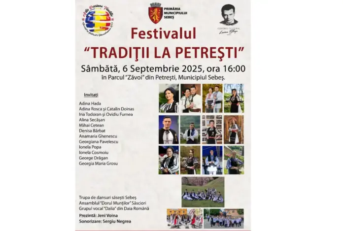 Festivalul „Tradiții la Petrești” a fost reprogramat și se va desfășura pe 6 septembrie, începând cu ora 16:00, în Parcul „Zăvoi” din Petrești, Municipiul Sebeș