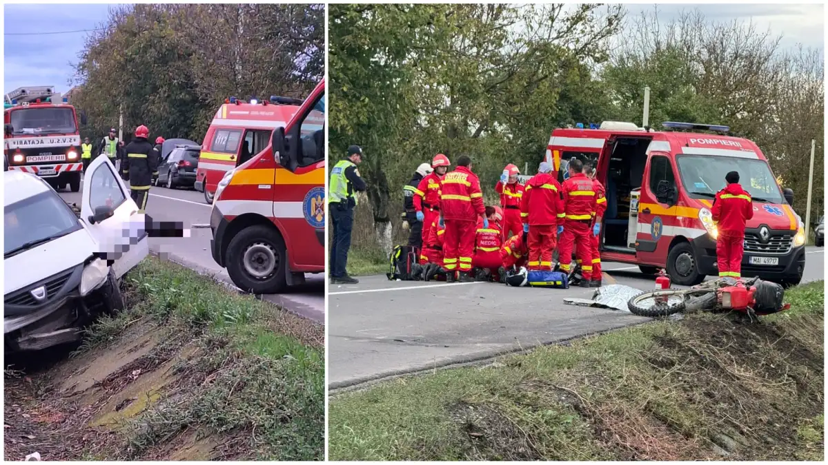 FOTO | Accident GRAV între două autoturisme și o motocicletă: Două persoane în stop cardio-respirator, echipajele medicale luptă pentru viața lor