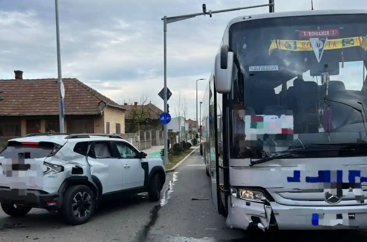 FOTO | ACCIDENT rutier în Alba Iulia: Un autocar cu 25 de persoane și o mașină s-au ciocnit în Partoș, pe strada Regimentul V Vânători