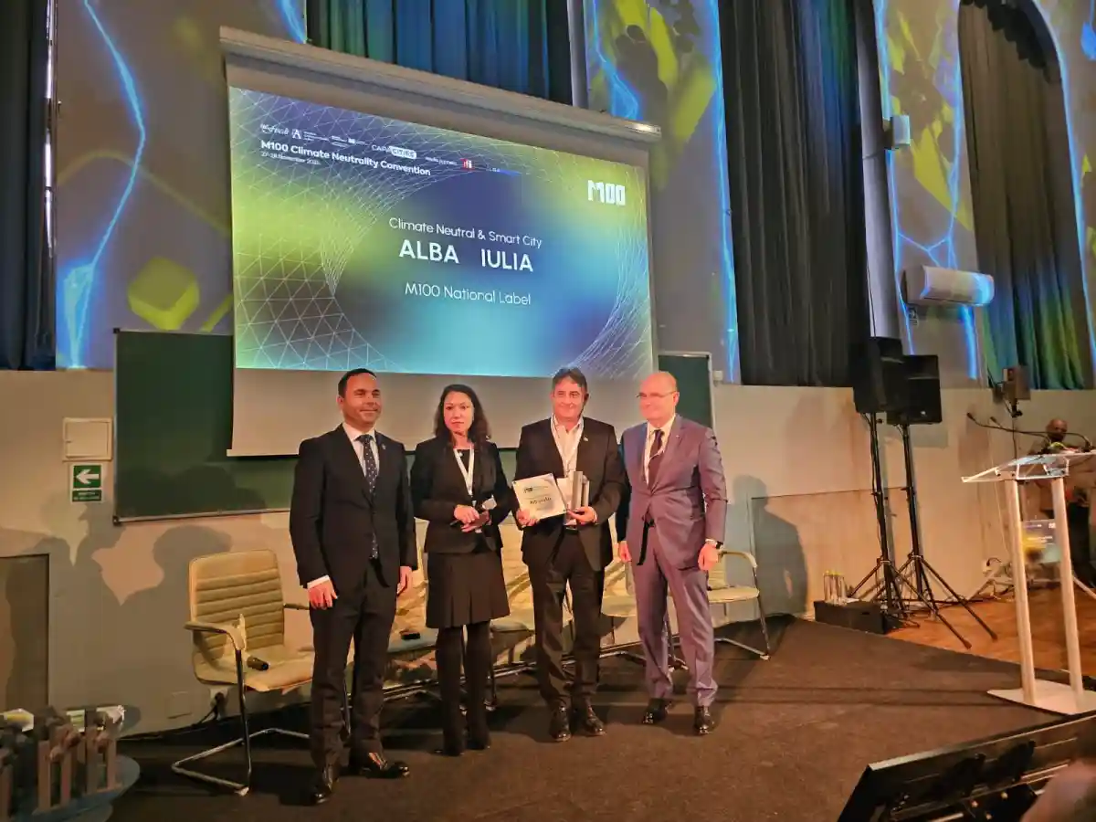 Municipiul Alba Iulia a primit joi, 27 noiembrie 2025, trofeul și distincția „M100 Label”, în cadrul Convenției M100 pentru Neutralitate Climatică 2025 care a avut loc la București.