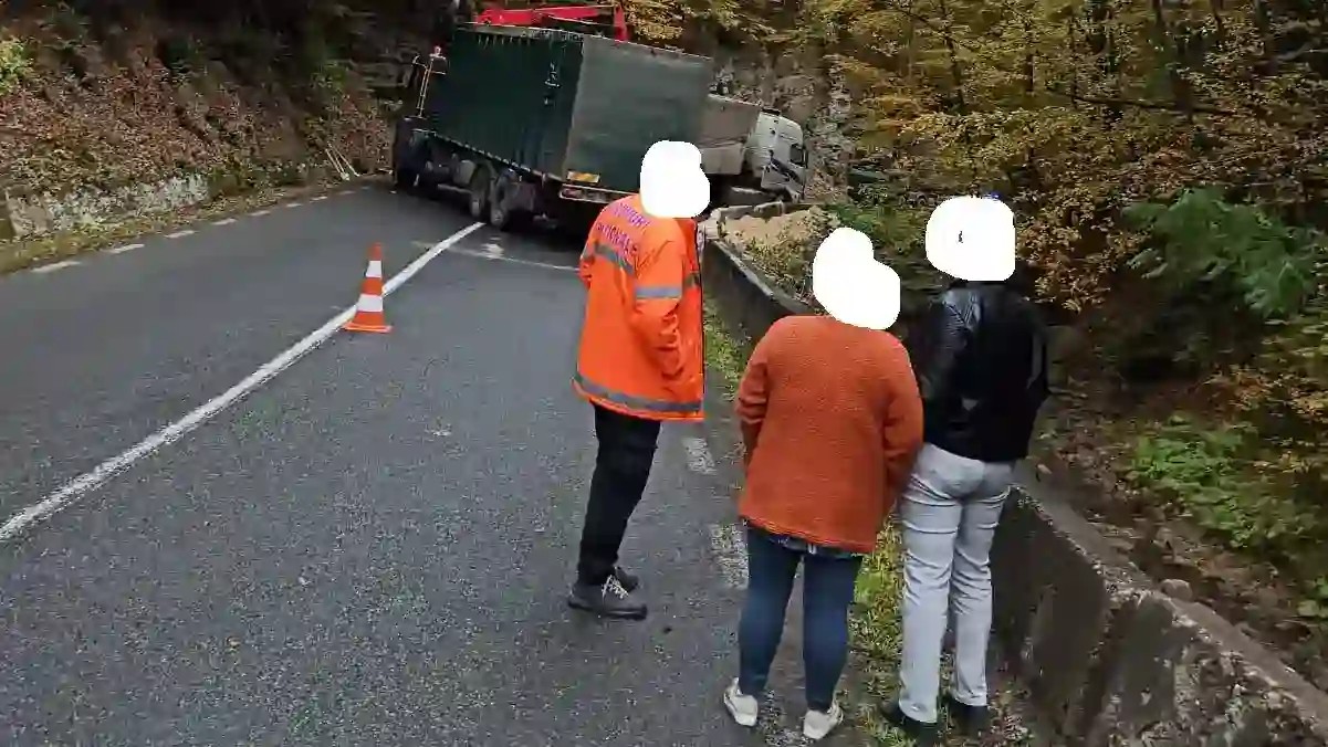 FOTO | Autocamion „înțepenit” de-a curmezișul șoselei după impactul cu parapetele, pe DN 74, pe Dealul Mare