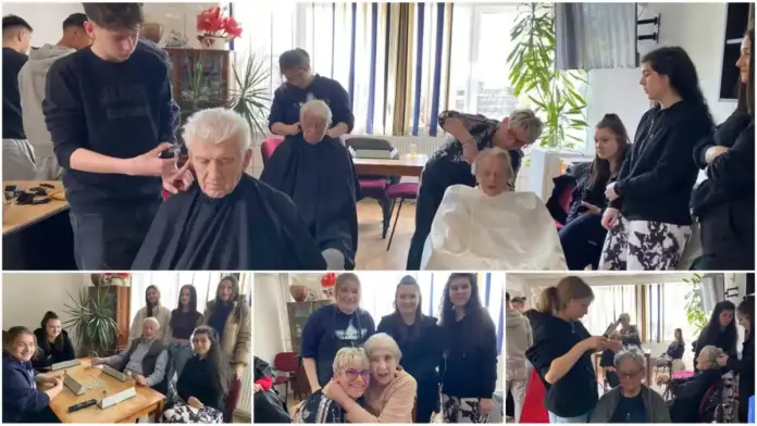 Bunicii de la Căminul de Vârstnici din Alba Iulia, coafați și tunși GRATUIT înainte de Paște, de elevii unui liceu din municipiu
