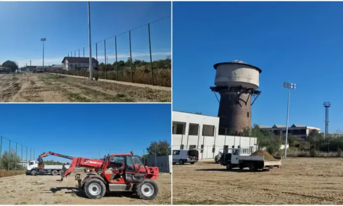 FOTO | Lucrările la baza sportivă din Teiuș, reluate: Se montează pilonii de susținere a iluminatul nocturn