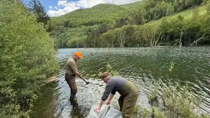 FOTO | O nouă acțiune de populare realizată de AJVPS Alba: Peste 5.000 de puieți de păstrăv indigen introduși în lacul de acumulare Mihoești