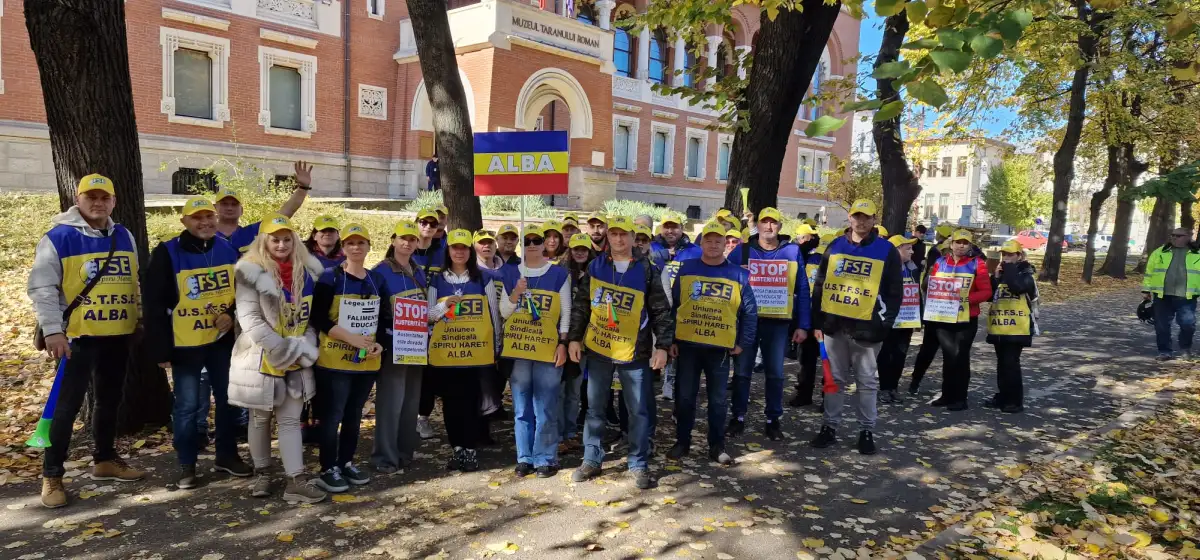 FOTO | Sindicaliștii FSE „Spiru Haret” Alba au protestat împotriva măsurilor guvernamentale: „Austeritatea nu doar dăunează economiei – ea distruge și educația!”