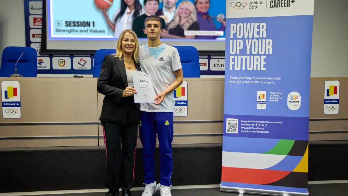 FOTO | Sportivul Alecsandru Boloage, elev la LPS Alba Iulia, interacțiune cu Nadia Comăneci: „O onoare de a fi alături de legenda sportului românesc”