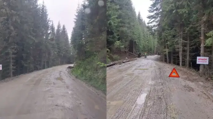 FOTO | Starea drumului Oașa-Șureanu. Antreprenor care exploatează lemn în zonă: „Societatea noastră a intervenit prompt pentru remedierea situației și curățarea zonelor afectate”