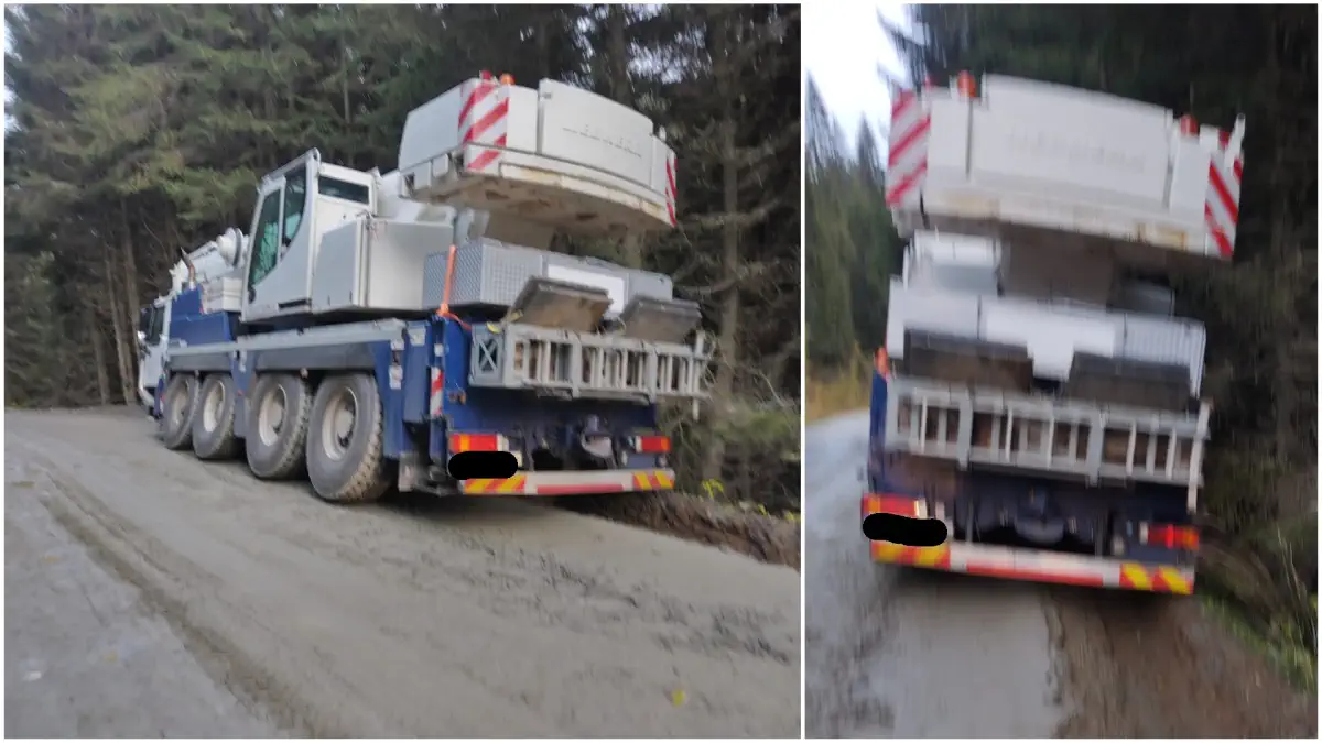 FOTO ȘTIREA TA | Drumul dintre Oașa și Luncile Prigoanei s-a rupt sub greutatea unei macarale