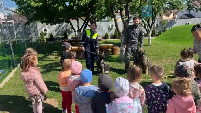 FOTO | Tina și Bruno au stârnit admirație în rândul copiilor de la Școala Primară ,,1 Decembrie 1918” Alba Iulia: Activitate informativ-preventivă derulată de polițiști, însoțiți de superbe patrupede