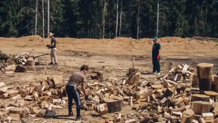 IMAGINI VIRALE: Tineri participanți la Tabăra Internațională Oașa 2025 tăind lemne: „Mai sunt băieți care știu să crape lemne”