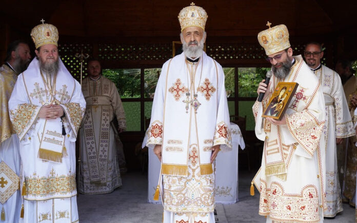 Înaltpreasfințitul Părinte Irineu însoțit de Preasfințiții Părinți Episcopi Timotei și Teofil de Iberia, prezenți la hramul Mănăstirii „Sfântul Proroc Ilie Tesviteanul”, de la Albac