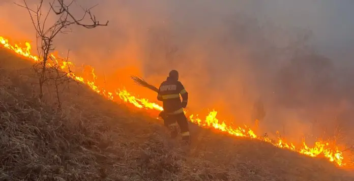 INCENDIU de vegetație uscată la Ciumbrud, în apropiere de autostrada A10: Intervin pompierii din Aiud