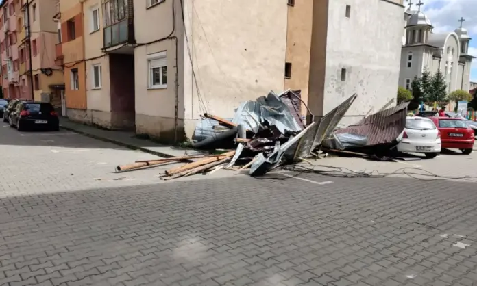 Intervenție ISU Alba pentru îndepărtarea unor elemente de construcție desprinse, pe o stradă din Alba Iulia
