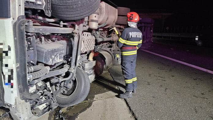 Persoană rănită, după ce un autocamion care transporta lemne s-a răsturnat pe Autostrada A1, sensul de mers Sebeș-Orăștie