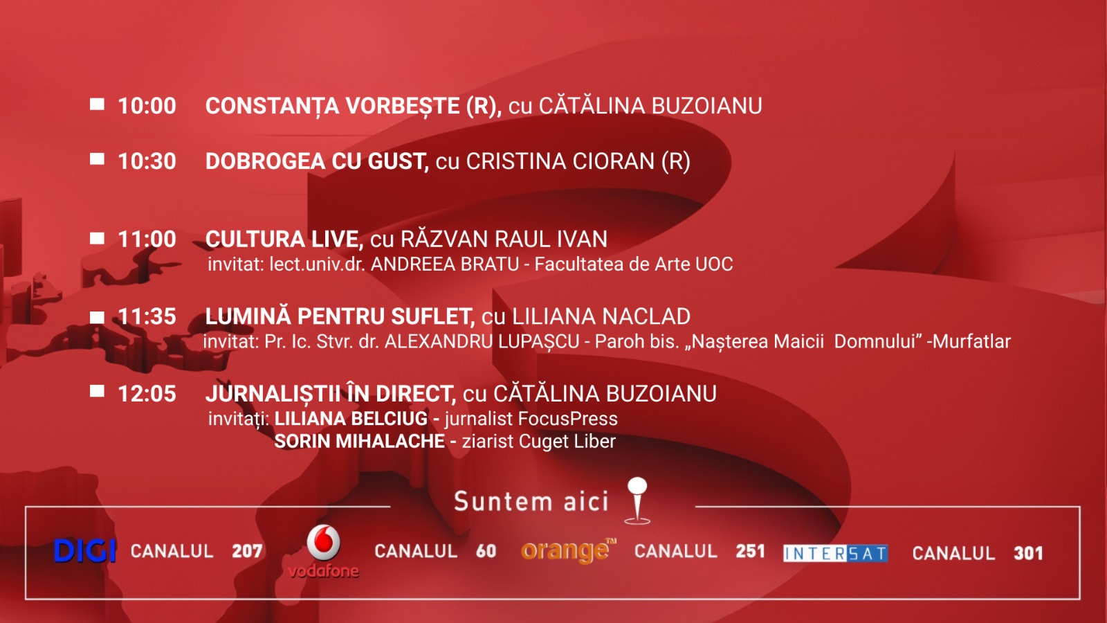 10:00 CONSTANȚA VORBEȘTE (R), cu CĂTĂLINA BUZOIANU10:30 DOBROGEA CU GUST, cu CRISTINA CIORAN (R) 11:00 CULTURA LIVE, cu RĂZVAN RAUL IVAN …