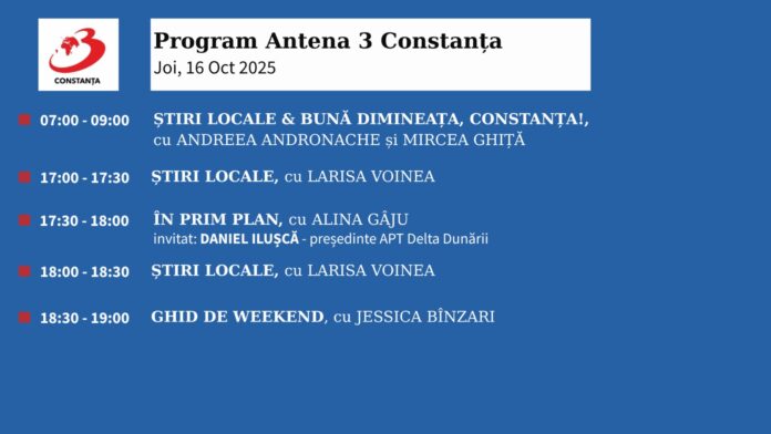 Programul zilei de joi, 16 octombrie, de la Antena 3 Constanța