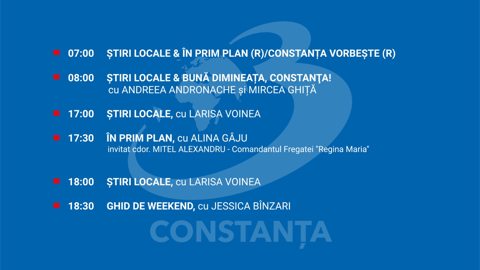Ziua începe la ora 07:00 cu „Știri Locale & În Prim Plan (R)” și continuă cu „Constanța Vorbește (R)”, oferind o privire de ansamblu asupra celor mai importante evenimente ale momentului.De la ora 08:00, „Bună dimineața, Constanța!”, prezentată de Andreea Andronache și Mircea Ghiță, aduce energie, informații utile și subiecte de interes local pentru un început de zi plin de dinamism.Seara, începând cu ora 17:00, Larisa Voinea revine cu „Știri Locale”,…