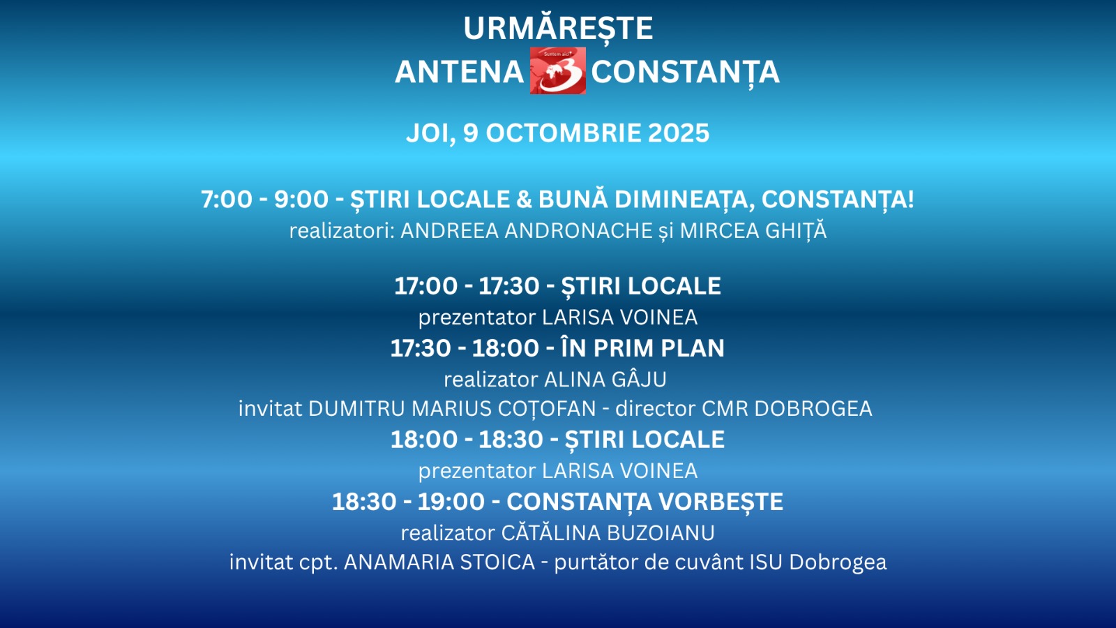 07:00 – 09:00ȘTIRI LOCALE & BUNĂ DIMINEAȚA, CONSTANȚA!Începem ziua cu cele mai importante informații din județ și din regiune.Realizatori: Andreea Andronache și Mircea GhițăO ediție matinală plină de energie și subiecte relevante pentru constănțeni.17:00 – 17:30ȘTIRI LOCALECele mai noi informații din Constanța și Dobrogea, prezentate de Larisa Voinea.17:30 – 18:00ÎN PRIM PLANRealizatoarea Alina Gâju stă de vorbă cu Dumitru Marius Coțofan, directorul CMR Dobrogea,…