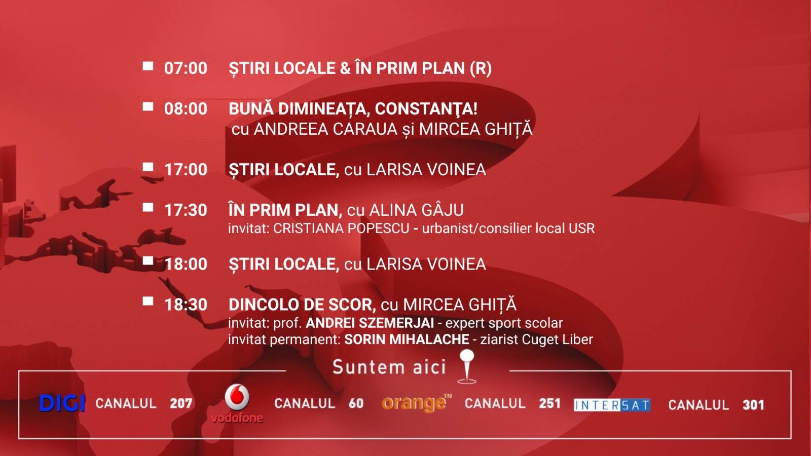 Dimineața începe cu informațiile care contează. De la ora 07:00, urmăriți „Știri Locale & În Prim Plan”, pentru cele mai importante evenimente din Constanța și județ.De la 08:00, Andreea Caraua și Mircea Ghiță vă dau trezirea cu o nouă ediție „Bună dimineața, Constanța!” – energie, subiecte de actualitate și invitați speciali.După-amiaza aduce informații proaspete:La 17:00, Larisa Voinea prezintă „Știrile Locale”, urmate de emisiunea „În Prim …