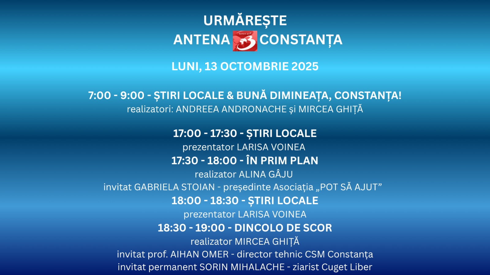 Dimineața începe cu „Știri Locale & Bună dimineața, Constanța!”, între 7:00 și 9:00, realizat de Andreea Andronache și Mircea Ghiță. Emisiunea aduce cele mai noi informații din oraș și județ, alături de subiecte de actualitate și invitați speciali.După-amiaza, de la 17:00 la 17:30, Larisa Voinea prezintă „Știrile Locale”, cu cele mai importante evenimente ale zilei.Urmează, între 17:30 și 18:00, emisiunea „În Prim Plan”, realizată de Alina Gâju,…
