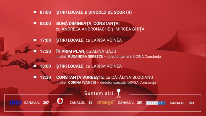 07:00 – Știri locale & Dincolo de scor (R)O retrospectivă a celor mai importante evenimente locale și sportive.08:00 – Bună dimineața, Constanța!Alături de Andreea Andronache și Mircea Ghiță, începeți ziua cu informații utile, interviuri și reportaje din oraș.17:00 – Știri locale, cu Larisa VoineaCele mai recente informații și evenimente din Constanța și împrejurimi.17:30 – În Prim-Plan, cu Alina GâjuInvitată: Ruxandra Serescu, director general CCINA …