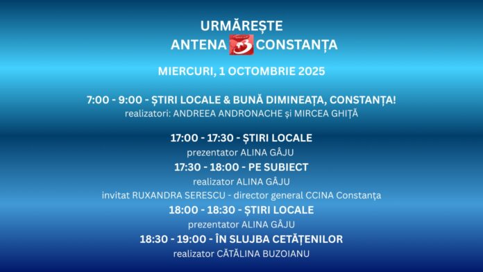 Dimineața, între orele 7:00 – 9:00, vă așteptăm cu ediția „Știri Locale & Bună dimineața, Constanța!”, realizată de Andreea Andronache și Mircea Ghiță, pentru cele mai proaspete informații și subiecte de interes din comunitatea noastră.După-amiaza, începând cu ora 17:00, veți putea urmări o nouă ediție a Știrilor Locale, prezentată de Alina Gâju. Urmează, de la 17:30, emisiunea „Pe Subiect”, realizată de aceeași jurnalistă, care o are invitată pe…