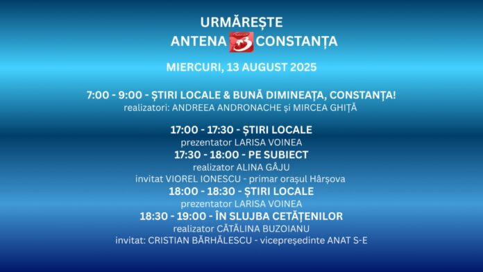 Dimineața începe cu energie la „Știri Locale & Bună dimineața, Constanța!” (07:00 – 09:00), alături de Andreea Andronache și Mircea Ghiță, care vă aduc cele mai importante informații din județ și vă pun la curent cu tot ce se întâmplă în oraș, într-o atmosferă caldă și prietenoasă.După-amiaza, de la ora 17:00, Larisa Voinea revine cu „Știri Locale”, pentru a vă prezenta principalele evenimente ale zilei.De la 17:30, în emisiunea „Pe Subiect”,…