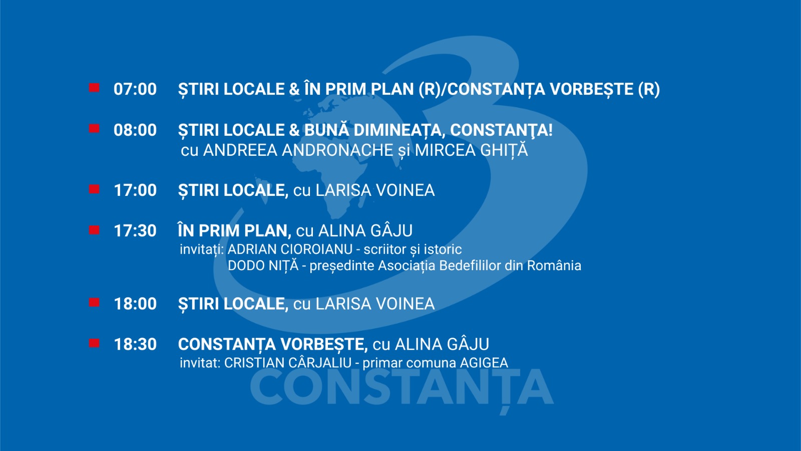 07:00 – Știri Locale & În Prim Plan (R) / Constanța Vorbește (R)O retrospectivă informativă a celor mai importante subiecte din actualitatea locală.08:00 – Știri Locale & Bună dimineața, Constanța!Cu Andreea Andronache și Mircea Ghiță – un început de zi plin de energie, informații utile și povești inspirate din Constanța.17:00 – Știri LocalePrezentate de Larisa Voinea, pentru a afla cele mai recente evenimente din județ și regiune.17:30 – În Prim …