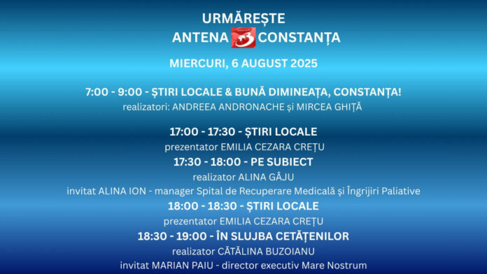 07:00 – 09:00Știri Locale & Bună dimineața, Constanța!Realizatori: Andreea Andronache și Mircea GhițăVă aducem cele mai importante informații ale dimineții, alături de subiecte de interes pentru constănțeni, interviuri și invitați speciali.17:00 – 17:30Știri LocalePrezentator: Emilia Cezara CrețuActualizările esențiale ale după-amiezii, cu știri din comunitate, administrație și evenimente locale.17:30 – 18:00Pe SubiectRealizator: Alina GâjuInvitat: Alina …