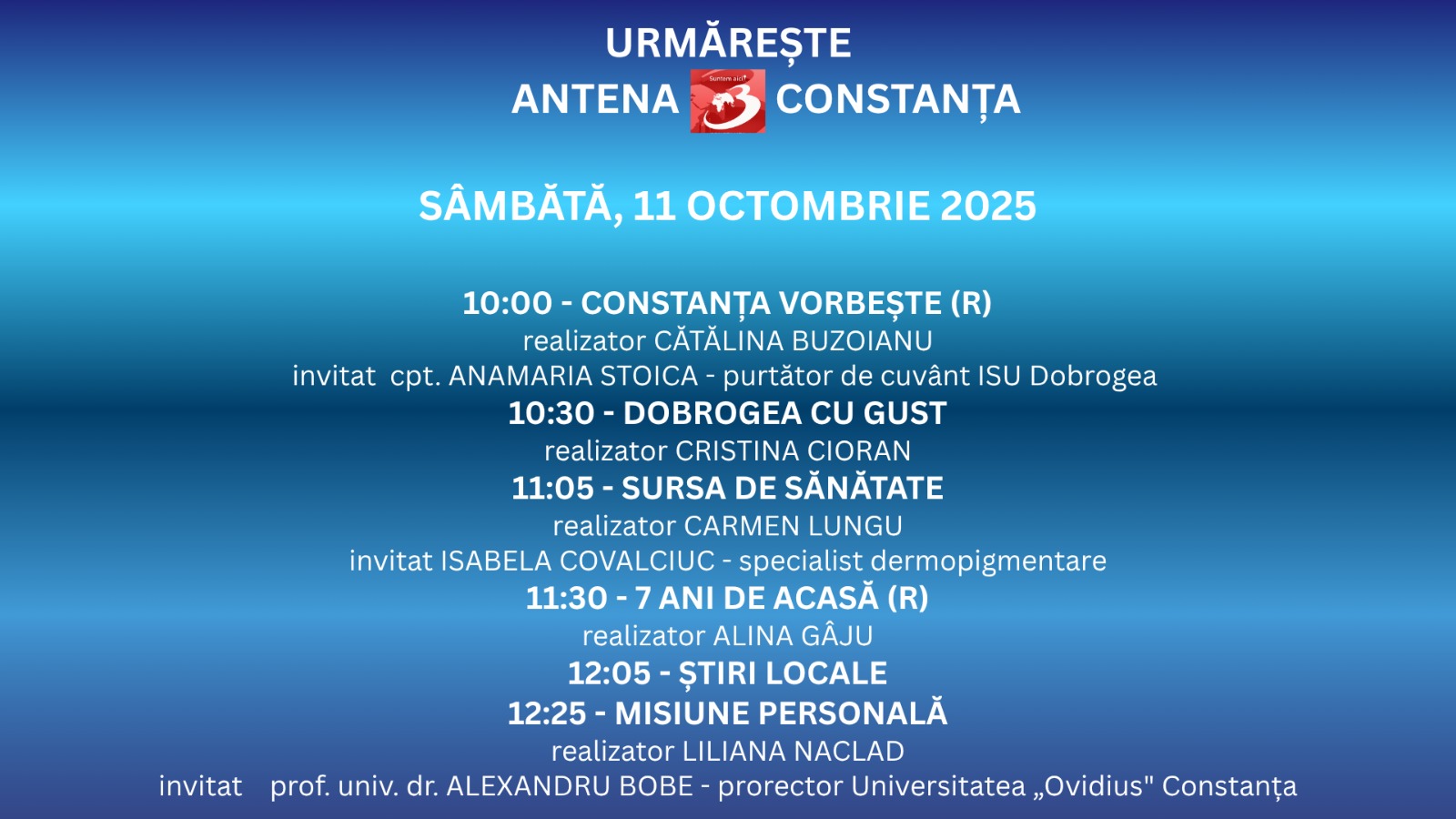 10:00 – Constanța vorbește (R)Realizator: Cătălina BuzoianuInvitat: cpt. Anamaria Stoica, purtător de cuvânt al ISU DobrogeaEmisiunea readuce în atenția publicului principalele subiecte legate de siguranța cetățenilor, intervențiile recente ale pompierilor și campaniile de prevenire derulate de Inspectoratul pentru Situații de Urgență Dobrogea. O discuție despre responsabilitate, solidaritate și implicare în comunitate.10:30 – Dobrogea cu gustRealizator: Cristina…