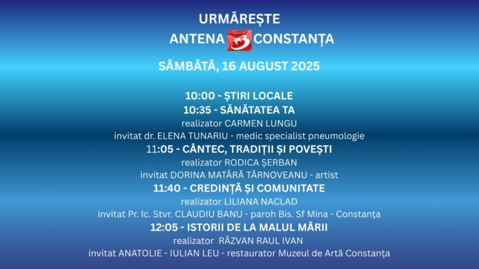 10:00 – Știri Locale – cele mai noi informații din Constanța și împrejurimi.10:35 – Sănătatea Ta cu realizator Carmen Lungu.Invitat: dr. Elena Tunariu, medic specialist pneumologie – sfaturi pentru o respirație sănătoasă și o vară fără griji.11:05 – Cântec, Tradiții și Povești cu Rodica Șerban.Invitată: Dorina Matără Târnoveanu, artist – povești din suflet și melodii de sezon.11:40 – Credință și Comunitate cu Liliana Naclad.Invitat: Pr. Ic. Stvr …