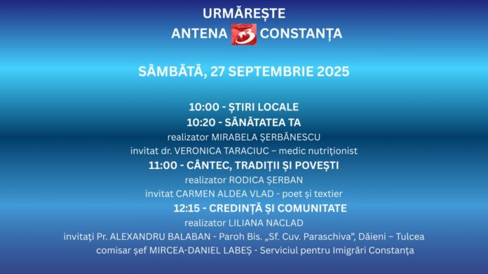 De la ora 10:00, ediția de Știri locale va deschide ziua cu cele mai recente informații din regiune.La 10:20, emisiunea Sănătatea ta, realizată de Mirabela Șerbănescu, o are invitată pe dr. Veronica Taraciuc, medic nutriționist, care va oferi sfaturi utile pentru un stil de viață echilibrat.De la ora 11:00, programul Cântec, tradiții și povești, realizat de Rodica Șerban, propune o incursiune în universul artistic și cultural, alături de invitata sa, Carmen Aldea Vlad…