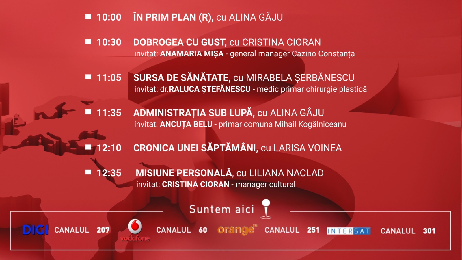 10:00 – Reluare „În Prim-Plan”, realizată de Alina Gâju.10:30 – „Dobrogea cu Gust”, cu Cristina Cioran și invitată Anamaria Mișa, manager Cazino Constanța, despre evenimentele culturale și gastronomice din județ.11:05 – „Sursa de Sănătate”, cu Mirabela Șerbănescu și invitată dr. Raluca Ștefănescu, medic primar chirurgie plastică.11:35 – „Administrația sub Lupă”, cu Alina Gâju și invitată primarul Ancuța Belu, despre dezvoltarea comunei Mihail …