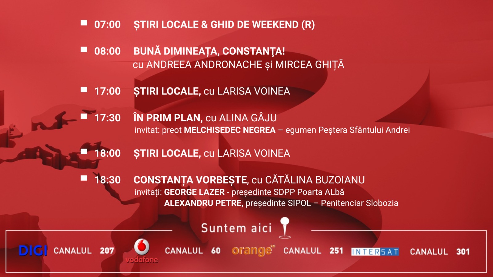 De la ora 07:00 vă invităm să urmăriți Știri Locale & Ghid de Weekend (reluare).De la ora 08:00, începe emisiunea Bună dimineața, Constanța!, realizată de Andreea Andronache și Mircea Ghiță.De la ora 17:00, Larisa Voinea revine cu ediția de după-amiază a Știrilor Locale.De la ora 17:30, vă propunem emisiunea În Prim Plan, moderată de Călina Gâju, avându-l ca invitat pe preotul Melchisedec Negrea, egumenul Peșterii Sfântului Andrei.La ora 18:00, continuăm cu o …