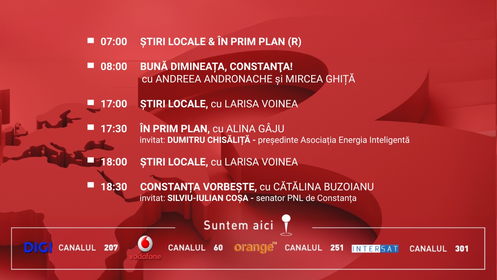 Dimineața începe cu „Știri Locale & În Prim-Plan” (R), urmată de emisiunea „Bună dimineața, Constanța!”, moderată de Andreea Andronache și Mircea Ghiță, care aduce cele mai proaspete informații și subiecte de interes pentru constănțeni.După-amiaza, începând cu ora 17:00, Larisa Voinea prezintă știrile locale, oferind cele mai importante actualizări din județ. La 17:30, realizatoarea Alina Gâju moderează emisiunea „În Prim Plan”, având invitat pe …