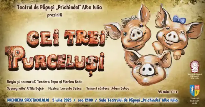 Sâmbătă, 5 iulie 2025 | Spectacolul „Cei trei purceluși”, în premieră pe scena Teatrului de Păpuși „Prichindel” din Alba Iulia