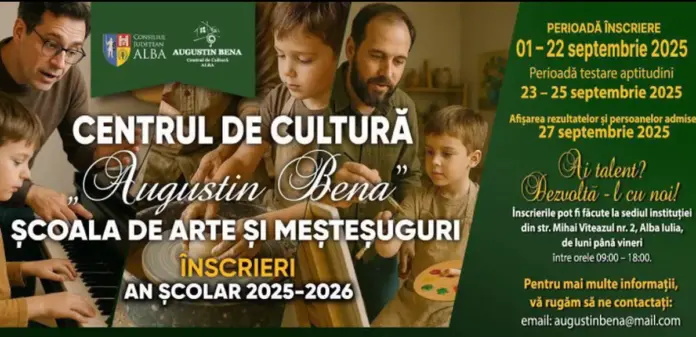 Centrul de Cultură „Augustin Bena” Alba a anunțat deschiderea înscrierilor pentru anul școlar 2025-2026 la Școala de Arte și Meșteșuguri, oferind oportunitatea tinerilor și adulților de a-și descoperi și dezvolta talentul artistic.
