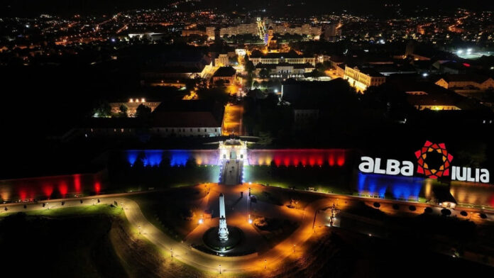 Sigla Municipiului Alba Iulia, vizibilă de pe Autostrada A10. Inscripție 3D, inspirată din modelul de la Hollywood, amplasată pe zidurile Cetății