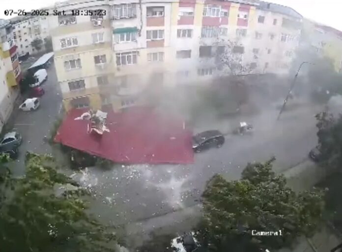 Furtunile şi vijeliile au făcut prăpăd în câteva județe, sâmbătă, în timp ce alte zone din țară s-au topit sub caniculă. La Calafat, acoperișul unei clădiri a căzut pe șosea. Puțin a lipsit să strivească doi oameni. Camerele de supraveghere au surprins momentul.În imagini se vede cum acoperișul unei cladiri e smuls de vânt și se prăbușește pe șosea. Doi pietoni scapă, ca prin minune.„Noroc chior”O mașină, care era în mers, și în care se afla doar…