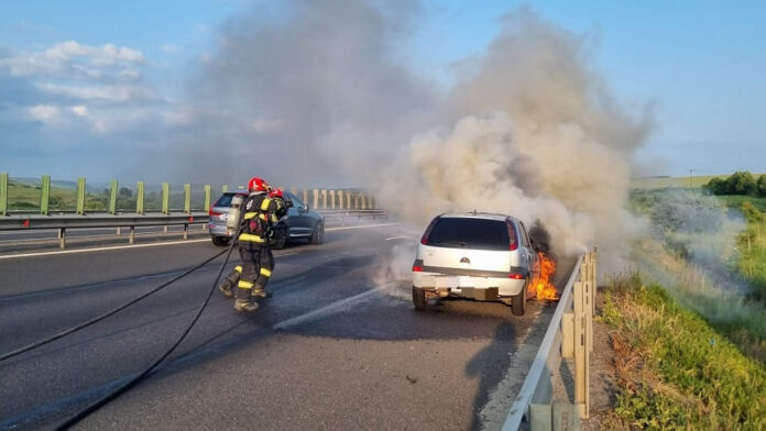 Un autoturism a luat foc pe Autostrada A1. Intervin pompierii militari din Sebeș