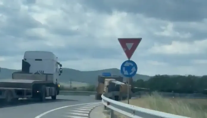 VIDEO | ACCIDENT pe autostrada A10: Un tractor transportat pe remorca unui camion s-a răsturnat pe carosabil în zona nodului de la Decea