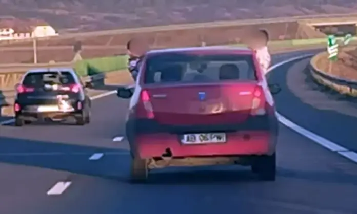 Imagini șocante pe autostrada Transilvania: Doi copii ieșiți cu jumătate de corp pe gemurile unei mașini cu numere de Alba, care gonea cu viteză, filmați de participanții la trafic
