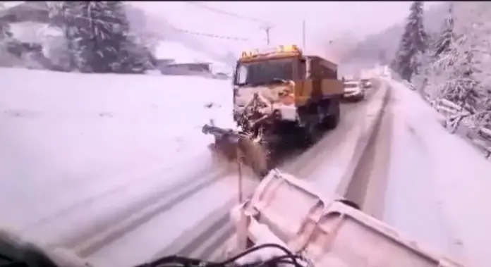 VIDEO | Intervenție în forță pe DN 75, în Alba: Drumarii acționează cu lamă și material antiderapant pentru îndepărtarea zăpezii de pe carosabil